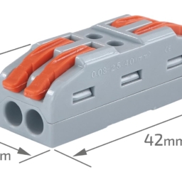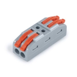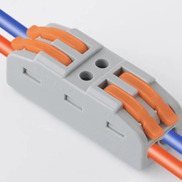 Pack of 2 Universal feed-through connection terminal. The terminal captures fine-wire conductors from 0.08 mm2 to 2.5 mm2 without tools. The recessed terminal lever prevents accidental incorrect pressing when inserting into a tight installation space. Suitable for use and connection of all types of conductors: connecting inductive motion sensors floor heating intercoms temporary connections connecting electric motors connecting lamps connecting special lamps electricity meters heating device thermal superchargers door control light garlands connecting electric machines potential connection connecting chandeliers connecting water pumps lighting combinations jalousie loudspeakers telephone cables notification and alarm device beds fire safety systems video surveillance systems Characteristics: Number of wires for installation: 2 Voltage: 250V Load: up to 4 kV Rated current: 32A Color: As per availablity Equipment: 1 x Universal feed-through connecting terminal CMK-422