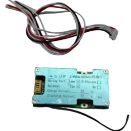The KP Original 4S LFP Lithium Battery BMS is a sophisticated battery management system designed for 4-cell LiFePO4 battery packs. With a robust current rating of 20A for both charging and discharging operations, this BMS efficiently monitors and controls your battery’s performance. The system features built-in discharge functionality and balance monitoring to ensure optimal cell health. The compact circuit board comes with pre-attached wiring ports that are clearly marked for easy installation, making it suitable for various DIY battery projects. The blue PCB board includes essential parameters clearly labelled, while the attached cables in red, black, and white colours are properly coded for straightforward connection. This BMS is an essential component for anyone building or maintaining lithium iron phosphate battery systems, providing necessary protection and monitoring capabilities for safe battery operation.