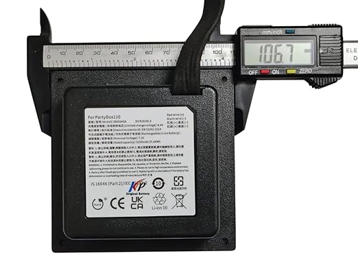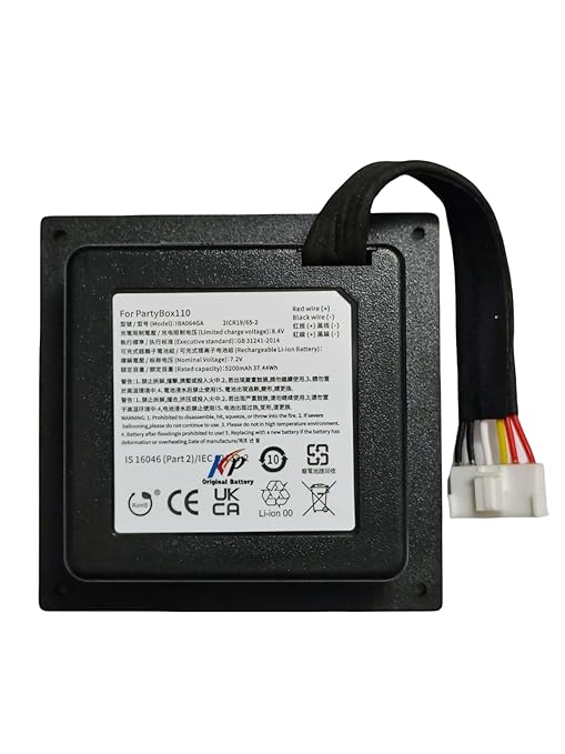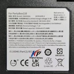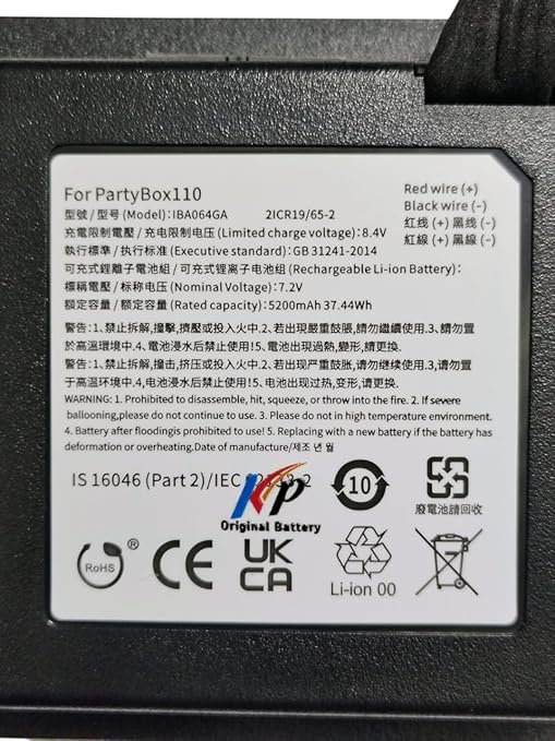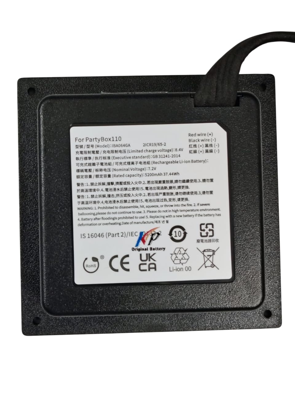 KP Original 7.2V 5200mAh / 37.44Wh Rechargeable Replacement Battery for PartyBox 110, IBA064GA, ICA002GA Product Parameters Fit Model: PartyBox 110 Volts:7.2 Capacity:5200mAh / 37.44Wh Product Type::Li-ion Weight:259.0g Size: 106.10 x 104.60 x 26.40mm Precautions before purchase 1.Carefully check the device model and original battery part number to determine whether the battery is compatible with the device. 2.Confirm that the plug is correctly connected to the equipment and installed. 227.Do not use a third-party adapter charger to charge the device, because the battery life will be shortened.”