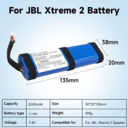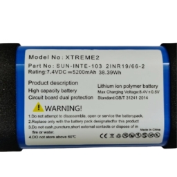 Experience superior power with this high-capacity 7.4V 5200mAh lithium-ion polymer battery, specifically designed for Xtreme 2 and Xtreme 3 Bluetooth wireless speakers. This replacement battery pack delivers an impressive 38.39Wh of power, ensuring extended playback time for your audio needs. The battery features dual circuit board protection and operates with a maximum charging voltage of 8.4V ±0.5V. Built to strict quality standards, this battery comes equipped with essential safety features and clear usage guidelines. The compact blue housing includes proper connectors for seamless compatibility with your speaker system. For optimal performance and longevity, avoid exposure to temperatures above 60°C and follow the provided handling instructions. This battery serves as a reliable power source for your premium wireless speaker, maintaining its powerful audio output for extended periods.