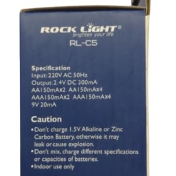 ROCK LIGHT Universal Battery Charger for AA, AAA, 9V Ni-MH Ni-CD Rechargeable Batteries with LED Light You can charge 4 AA/AAA,Ni-MH Ni-CD battery together or 2 9V battery together Output – 2.4 Volt*4@300mA DC or 9V DC@25mA*2 Input – 240Volt AC Alkaline or carbon battery is not allowed or single charge battery is not allowed.