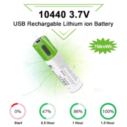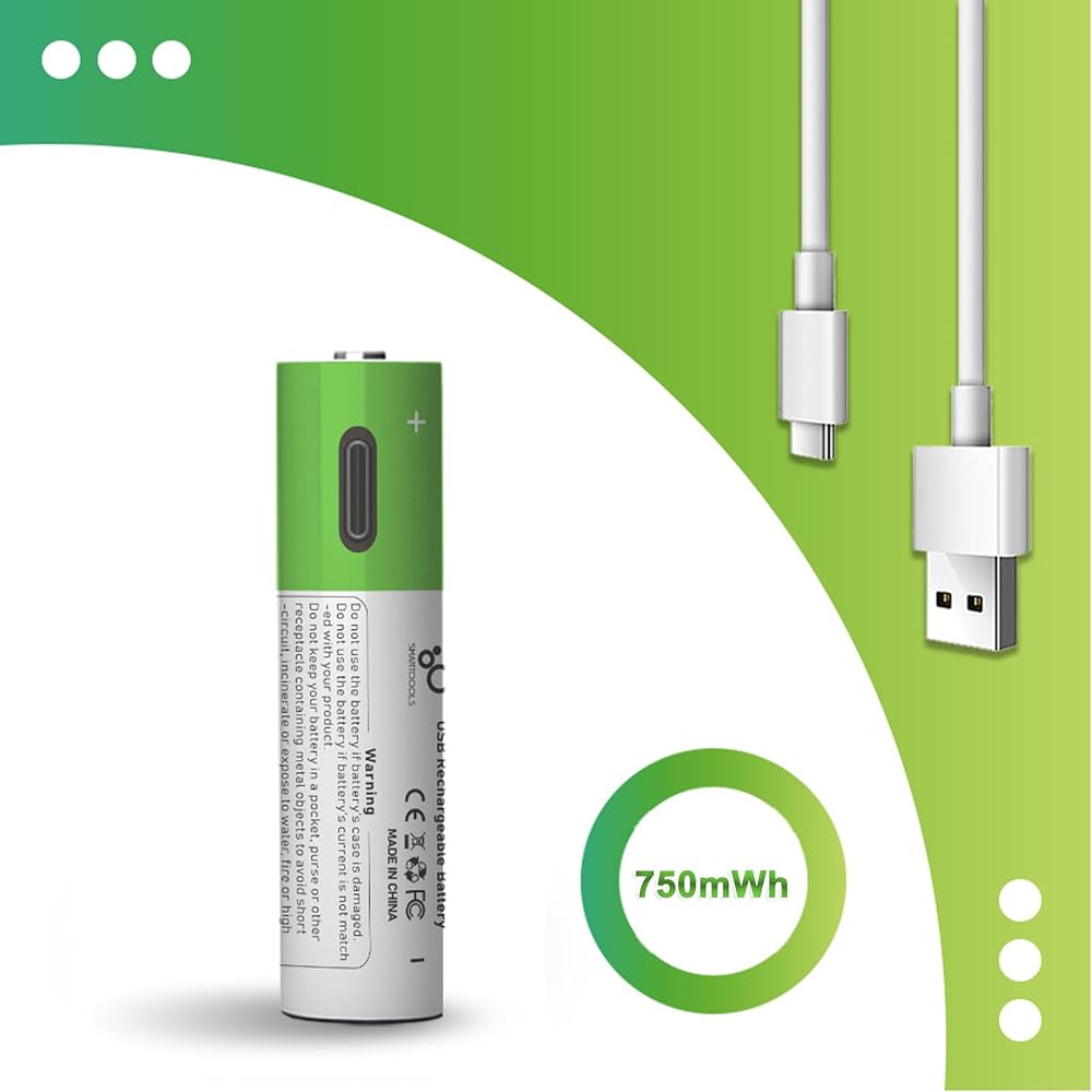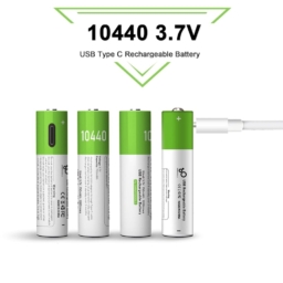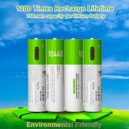 Power up your devices with these high-performance 10440 lithium-ion rechargeable batteries. Each battery provides 3.7 volts and 750mWh capacity, making them ideal for various electronic devices. Note that these are specifically 10440 batteries, not AAA batteries. The package includes 4 rechargeable batteries and a versatile 4-in-1 USB Type-C charger for convenient simultaneous charging. The bright green-topped design makes them easily identifiable, while the included charging cable features multiple connectors for enhanced compatibility. These batteries offer a practical solution for your regular power needs, reducing the need for frequent battery replacements. The compact size and reliable performance make them suitable for various portable electronics and devices that support 10440 battery specifications. 10440 Lithium-ion Type-c usb rechargeable battery 3.7V Model Number: 10440 Material: Lithium-ion battery Charging Method: Type-C usb cable Charging Voltage: 5V Norminal Voltage: 3.7V Typical: 750mAh Diameter: 10 mm Height: 44 mm Weight: 21 (+-0.5)g Charging time: 1 hour (+-0.5) LED Indicators: Blink when charging,Stay on when full charged Short-circuited/over-flowed/over-charged/over-discharged protection: YES