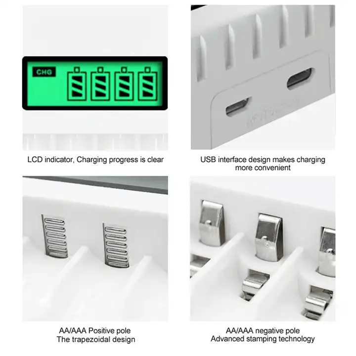 ① This charger can charge 1-4pcs AA/AAA Ni-MH/Ni-Cd rechargeable batteries,LCD displays. ② It can automatically transfer to tricle-charging, to ensure the batteries are fully charged. ③Built-in intelligent MCU control intelligent power-off function ④ The LCD shows the charging status. ⑤ With over-charge and over-temperature protection. Note: Only 1.2V AA/AAA rechargeable batteries can be charged LCD Display smart intelligent battery charger Fully compatible with AA/AAA Rechargeable Batteries *Quick charge *Full Automatic stop Quick charge LCD Display Safety charge Environmental material Four-slot independent channel charging Single charge, double charge, mixed charge Universal AA/AAA battery charging Only NiMH NiCd rechargeable batteries can be charged,ordinary alkaline and carbon batteries cannot be charged. LCD display Smart charging The charging process is intuitive and clear,and you can underst and the charging situation throughout the process